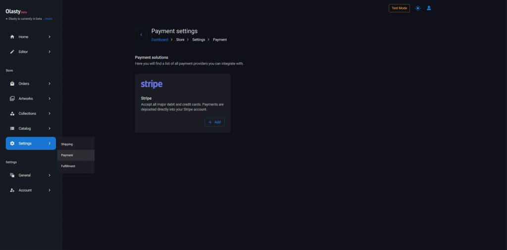 Olasty requires both your live and test Stripe keys to function correctly. When your store is in test mode, Olasty creates test orders and Stripe processes test transactions inside its test environment. This means you can walk through the entire checkout and fulfillment flow without any real money being charged.