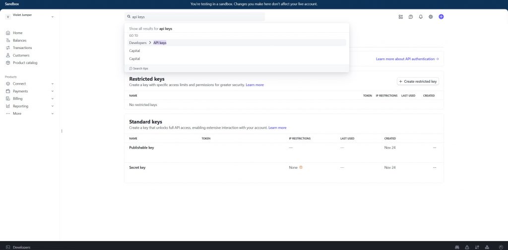 - In the top search bar, type API Keys and select Developers > API Keys.